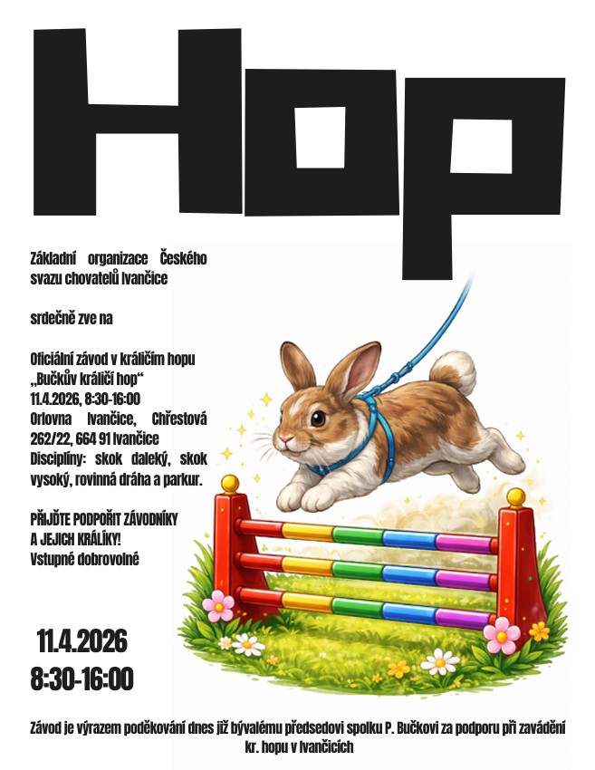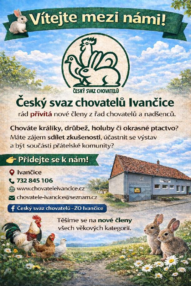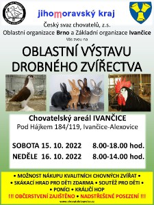 Ve dnech 18. - 19. října 2025 se v chovatelském areálu v Ivančicích uskuteční Oblastní výstava drobného zvířectva Brněnska. Více informací v konkrétní rubrice vlevo. Uzávěrka pro vystavovatele zvířat: POZOR - JEN DO NAPLNĚNÍ KAPACITY VÝSTAVNÍHO AREÁLU - POSÍLEJTE V PŘEDSTIHU!